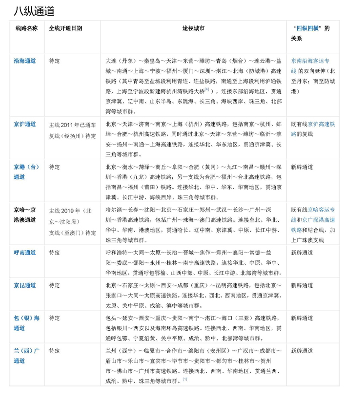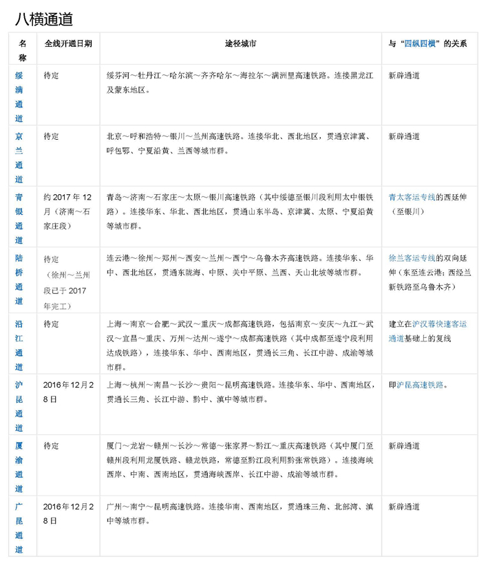 "八縱八橫" 是中國高速鐵路網絡的短期規劃圖。2016年7月,國家發展改革委、交通運輸部、中國鐵路總公司聯合發布了《中長期鐵路網規劃》,勾畫了新時期“八縱八橫”高速鐵路網的宏大藍圖。 “八縱”通道包括沿海通道、京滬通道、京港(臺)通道、京哈~京港澳通道、呼南通道、京昆通道、包(銀)海通道、蘭(西)廣通道?!鞍藱M”通道包括綏滿通道、京蘭通道、福銀通道、青銀通道、陸橋通道、沿江通道、滬昆通道、廈渝通道、廣昆通道。